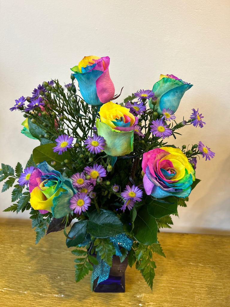 6 rainbow roses in a cobalt vase with premium greens and accent flowers.